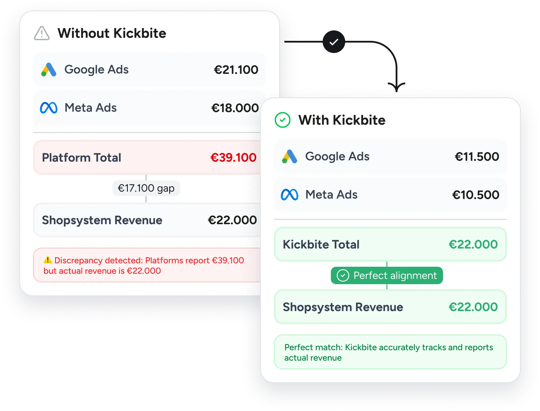 Kickbite provides a reliable view of your marketing performance by combining data from your shop, ad platforms, and its own tracking pixel. With accurate tracking and clean data, it helps you understand which channels truly drive revenue, so you can make confident, data-driven decisions.