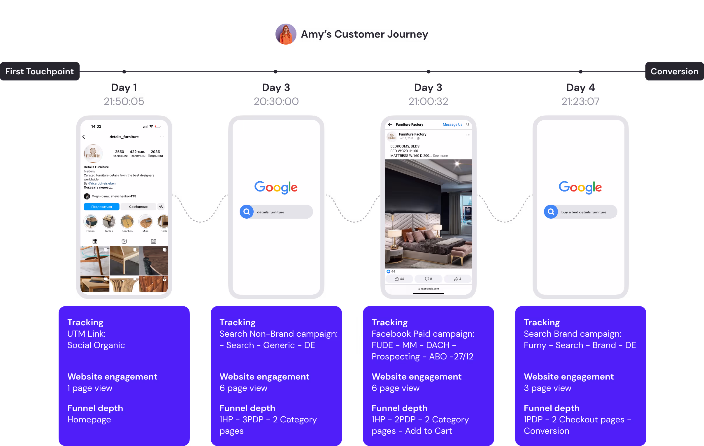 As a result, we determine the importance of each session or touchpoint in each of the stages. Here's an example for Amy: