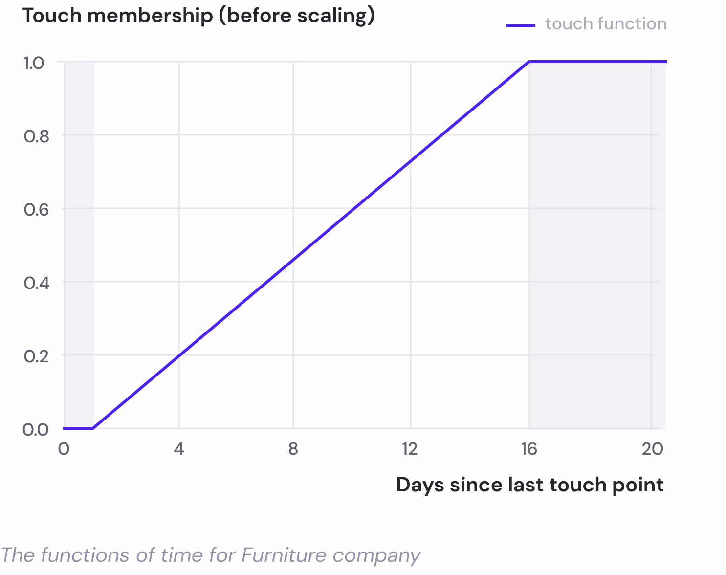The touch function always starts with 100% for the first touchpoint, then you evaluate the time with the next touchpoint. In this case, it was only 2 days after and based on the Touch function of time, the value will be “low”. Touch point 3 and 4 receive no value since the days in between are less than 1 day. After the respective computations the first touchpoint receives 0,8 of the touch phase and the second touchpoint 0,2.