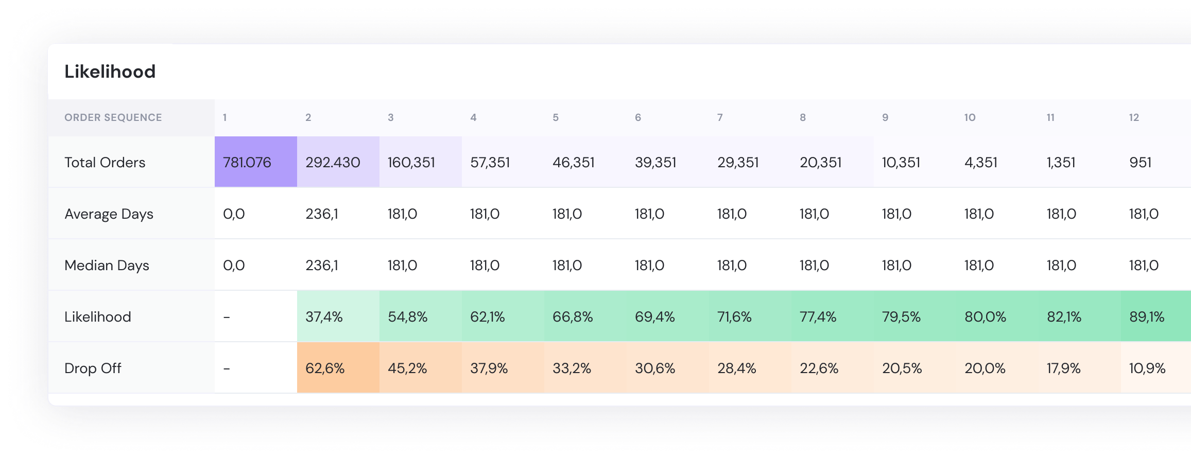 Using the Kickbite retention report, HelloPets analyzed reorder behavior and identified the order sequence with the lowest reordering probability. The data revealed the biggest drop-off occurred between the second and third purchase. After the third order, churn significantly decreased and customers showed strong loyalty behavior.